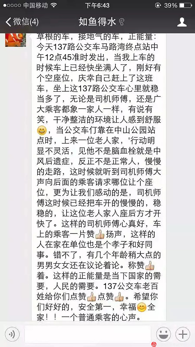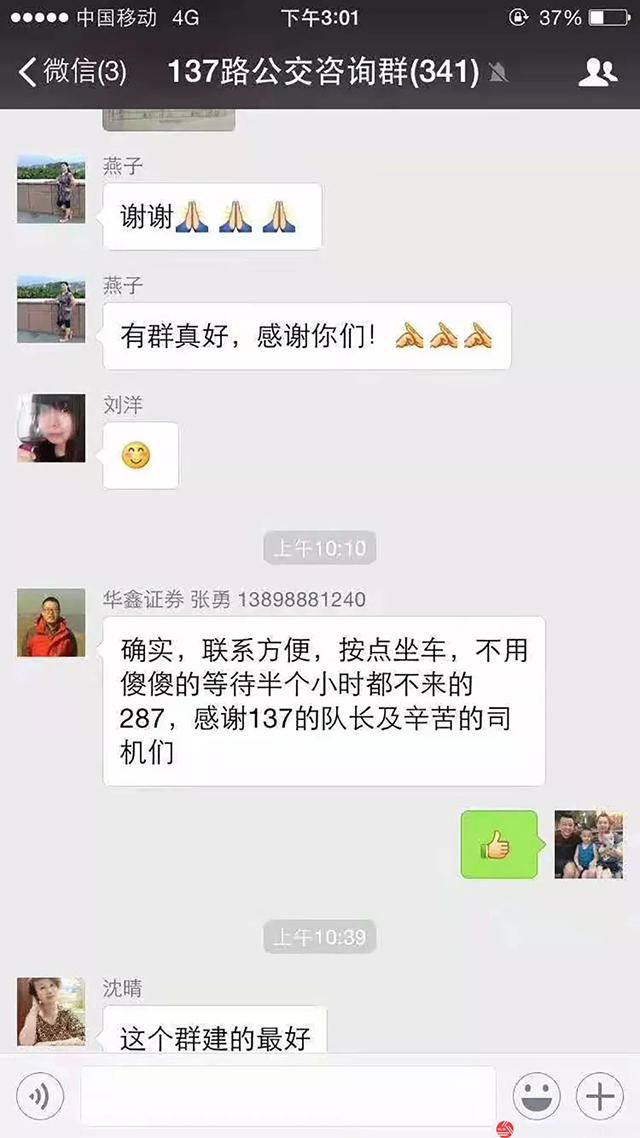沈蘇公司137路車隊(duì)于2017年年底創(chuàng)新性的建立了137路車隊(duì)公交咨詢?nèi)海鸪踝稍內(nèi)褐挥卸怀丝?,三個月后,137路車隊(duì)咨詢?nèi)阂呀?jīng)達(dá)到了350人左右。咨詢?nèi)旱慕?,方便了乘客與車隊(duì)之間的溝通,車隔時間的變化車隊(duì)會在咨詢?nèi)褐械谝粫r間發(fā)出通知,使乘客出行更加便捷與高效。