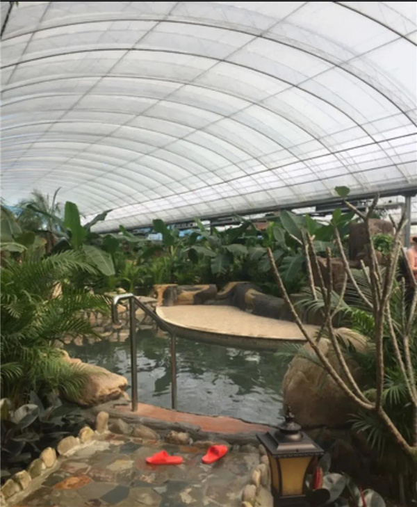 溫泉內各種功能性泡池,包涵游泳池,大型漂流河,按摩池,兒童戲水池等20余個,室外泡池3個,大型豪華游泳池,海南風情的綠色植物覆蓋的超級氧吧,空氣清新,香蕉樹,荔枝,芒果等等,水果樹科普展示,一年四季如畫,小橋流水,詩情畫意的浪漫生活品味,熱炕可同時容納200人。