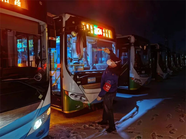 各車隊(duì)駕駛員提前到崗,一邊清理公交車上的積雪,一邊做好各項(xiàng)檢查工作,首班車均準(zhǔn)時(shí)發(fā)出。車隊(duì)管理人員對(duì)每一位出車的駕駛員做好安全叮囑工作,要求駕駛員謹(jǐn)慎慢行,督促駕駛員規(guī)范佩戴口罩,做好個(gè)人防護(hù),對(duì)運(yùn)營(yíng)車輛地面及扶手進(jìn)行一圈一消毒,一圈一通風(fēng),做好安全保障和疫情防控工作。