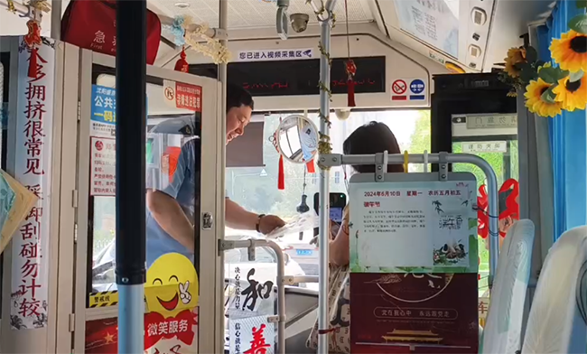 260路四星級駕駛員繆立眾早早來到工作崗位,做好出車前各項(xiàng)準(zhǔn)備工作的同時,還將提前準(zhǔn)備好的五彩繩、香包、葫蘆等寓意平安、健康的小禮物擺放在駕駛室。每到一站,他都起身微笑著向上車的乘客送上祝福,并將小禮物贈送給每一位乘客。收到祝福的乘客們充滿了驚喜和感動,紛紛豎起大拇指,對這位駕駛員的暖心舉動贊不絕口。