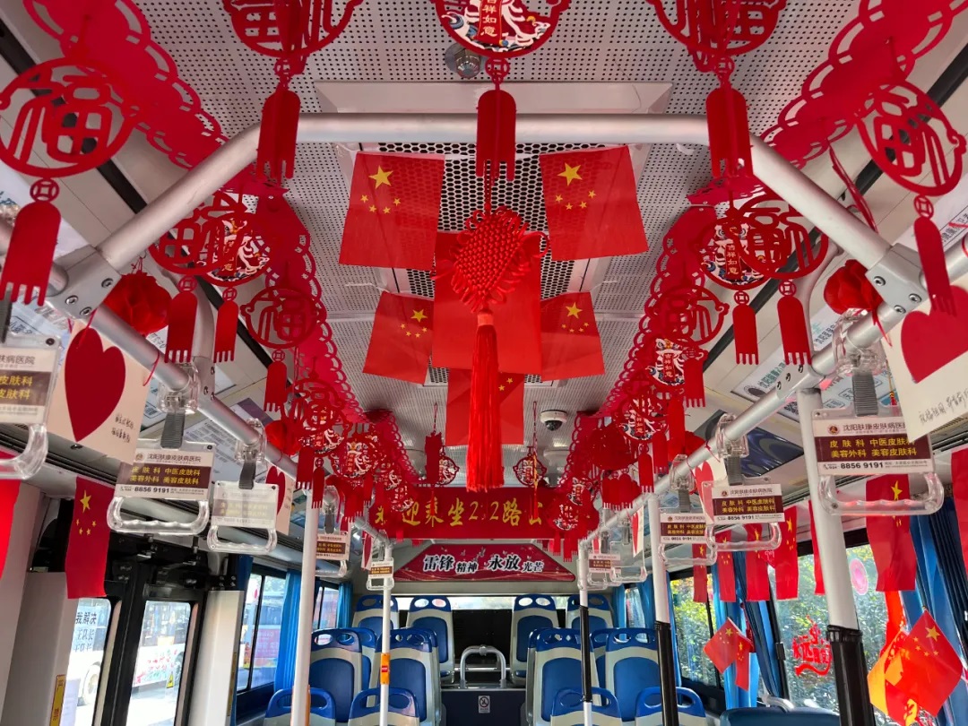 場(chǎng)面三:在沈陽(yáng)市勞動(dòng)模范、260路駕駛員繆立眾的車廂內(nèi),紅彤彤的國(guó)旗懸掛車廂兩側(cè),一句句祝福寄語(yǔ)祖國(guó),讓市民在乘車時(shí)也感受到濃厚的愛國(guó)情懷。