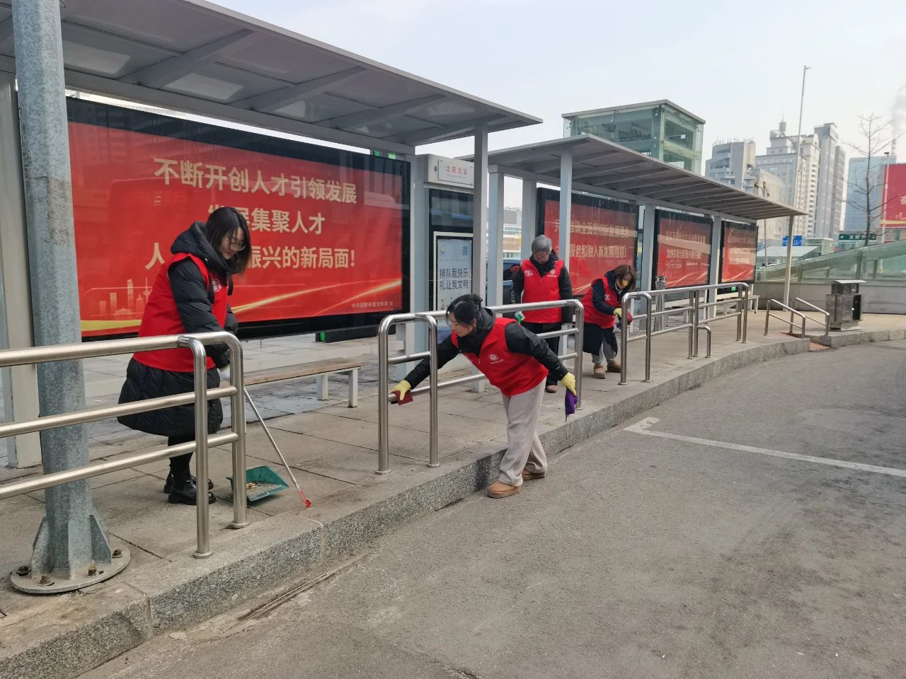 在北站公交樞紐站,志愿者們認(rèn)真清掃公交樞紐站內(nèi)的垃圾、擦拭公交候車?yán)纫约芭抨?duì)護(hù)欄,不放過(guò)任何一個(gè)衛(wèi)生死角,為乘客們營(yíng)造了一個(gè)整潔舒適的候車環(huán)境。