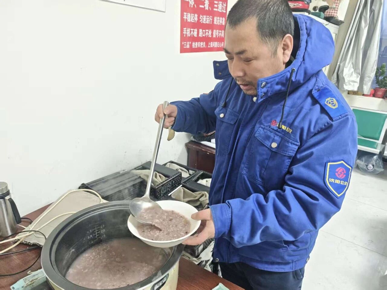 臘月初八臘八節(jié),天還未大亮,沈蘇公司128路車隊(duì)已熬好滿滿一鍋臘八粥,將溫?zé)岬男囊馐⑷胪胫?,為即將出發(fā)運(yùn)營的一線駕駛員送上一份暖胃更暖心的早餐。