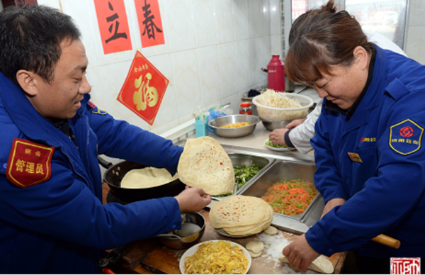 車隊齊隊長告訴記者,去年冬運開始后,沈陽各條公交線路終點站食堂為一線職工提供免費早午餐,保證駕駛員吃飽喝足再開工。“往常,早餐做花卷、雞蛋、粥等早點,午餐是兩素一葷,保證駕駛員營養(yǎng)充足。”齊隊長說,初七當(dāng)天是節(jié)后第一個工作日,2條線路60名駕駛員全部到崗。當(dāng)天恰逢“立春”,立春是二十四節(jié)氣之首,是民間最為重視的一個節(jié)氣,這一天素有吃春餅、鞭春牛等習(xí)俗。車隊條件簡單,但為了讓大家伙感受春的氣息,讓司機一起“咬春”,車隊工作人員初六那天就采購好卷餅菜所需的食材,當(dāng)天一大早就來到站房和面、烙餅。記者注意到,吃完春餅,齊隊長還給每人發(fā)了一個“平安果”,寓意新的一年平平安安。