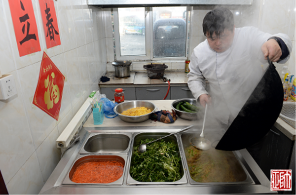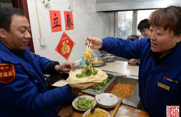 “哎呦,今天烙春餅啦!難怪老遠兒就聞見了香味兒。快,給我先來兩張!”2月3日大年初七,是節(jié)后的第一個工作日,恰逢立春。11時左右,211路駕駛員張智剛跑完一圈兒回到大北門終點站,就被食堂的飯香吸引過去。